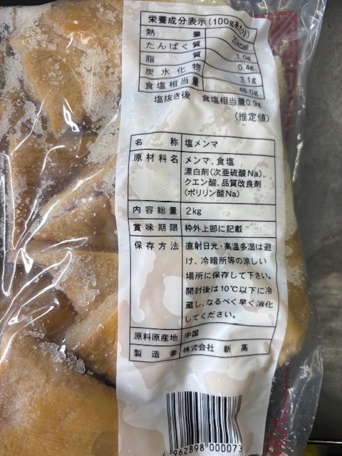 原材料名 メンマ 食塩 漂白剤(次亜硫酸Na) クエン酸 品質改良剤(ポリリン酸Na)